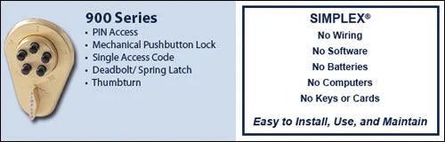 Simplex 900 (917/919/935/938 models) Series - Deadlocking Latch See all Simplex 900 locks here The 900 series surface mounted keyless lock presents a push button interface with full mechanical access control. Generally mounted above an existing keyed-in lock, this lock can be used as a primary or secondary lock. It provides a no key, convenient solution for residential and light office doors. Backed by the iconic Simplex name, the 900 series won't let you down.