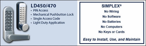 Turn your home, small office, and other light traffic doors keyless with this upscale new keypad lock by dormakaba Access. At a price where you want it, the new Simplex LD450 series allows you to manage your day's business instead of managing keys. You may have cheated losing your keys or the accidental "I locked myself out!" up to now, but why leave it to chance any longer. For less than half the cost of an iPod or internet-enabled phone, you can have this light-duty, wire and cable free keyless lock on your door in minutes. You'll never have to worry about whether you remembered your keys ever again! Don't be fooled by similar looking locks at a cheaper price. Some companies may claim to be offering you a lock, and rightly so, but is it a secure locking device. Cheap knock-off locks can be compromised with the right know-how. This one by Kaba easily passes the test in durability, and reliability. The inside and outside housings, as well as the knob, are solid cast. The pushbuttons are all metal. These are important construction concerns for long-term operability, and for installing the lock on a perimeter door, shed door, or any outside entryway that may be impacted by weather. The LD450 endures.